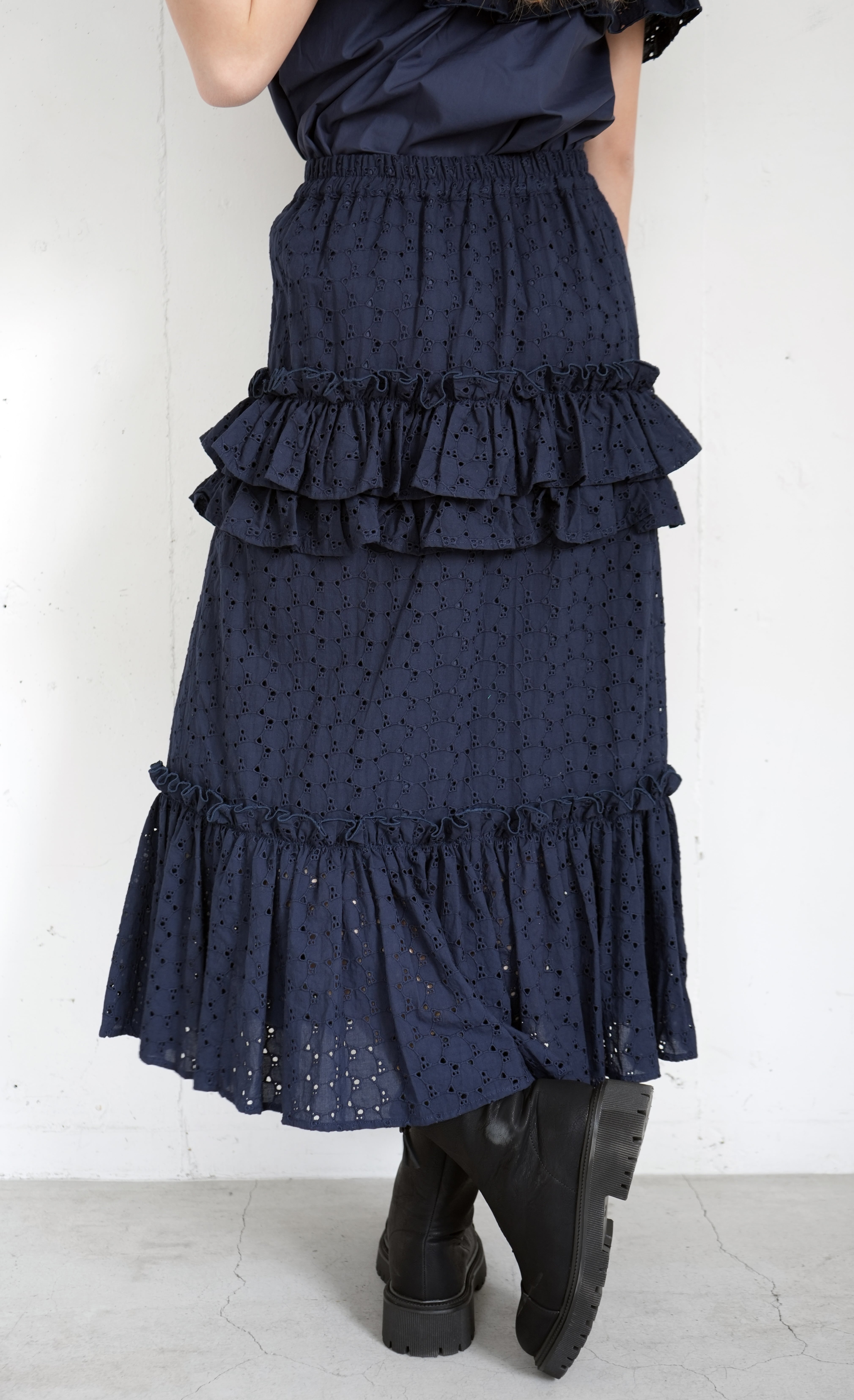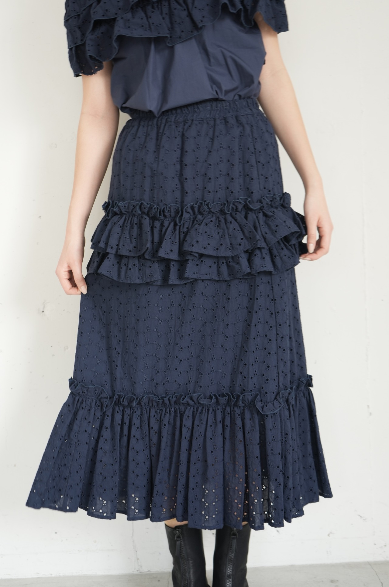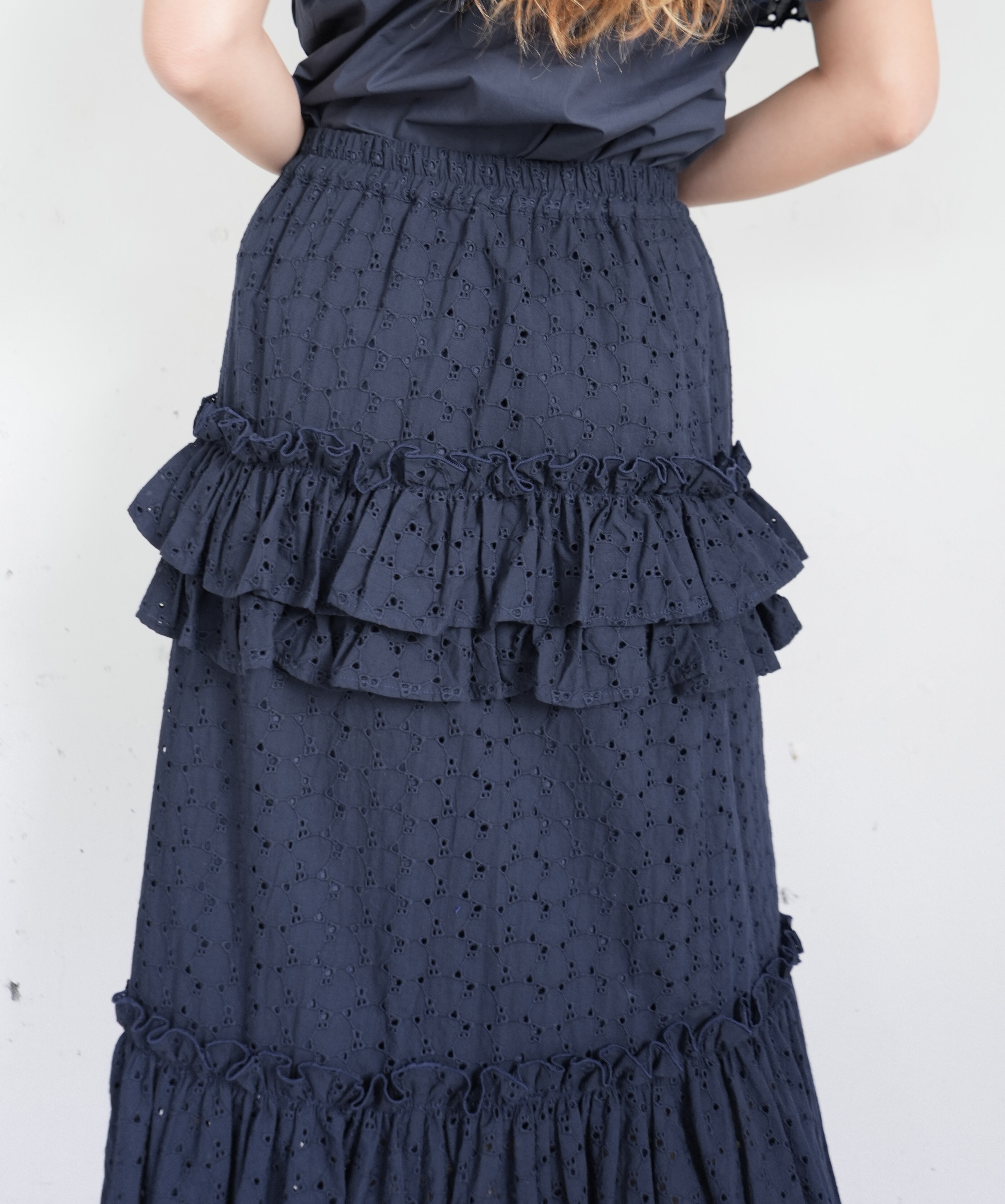 高級感のある生地に刺繍を施したエンブロイダリーレースをティアードスカートにすることで、シンプルながらも華やかな印象を与えるスカートです。