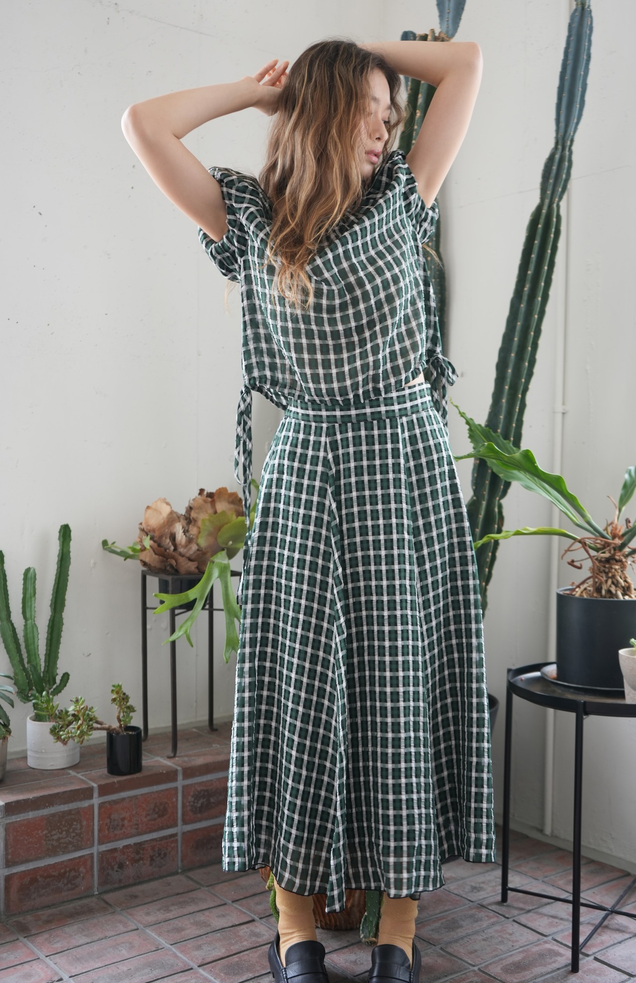 透け感のあるシアーチェック生地を使用した、春先から秋まで着られる軽やかな印象のセットアップ。