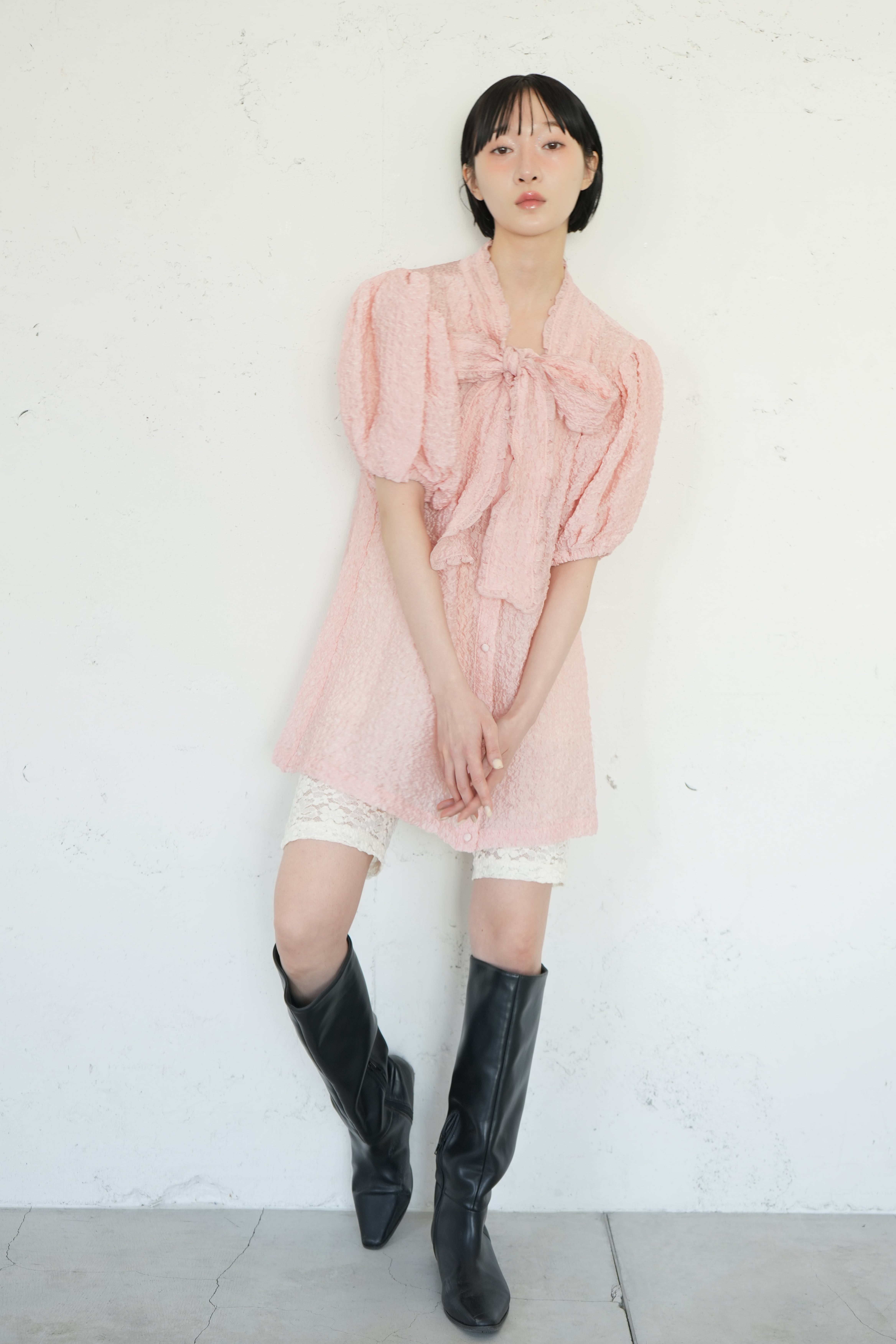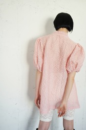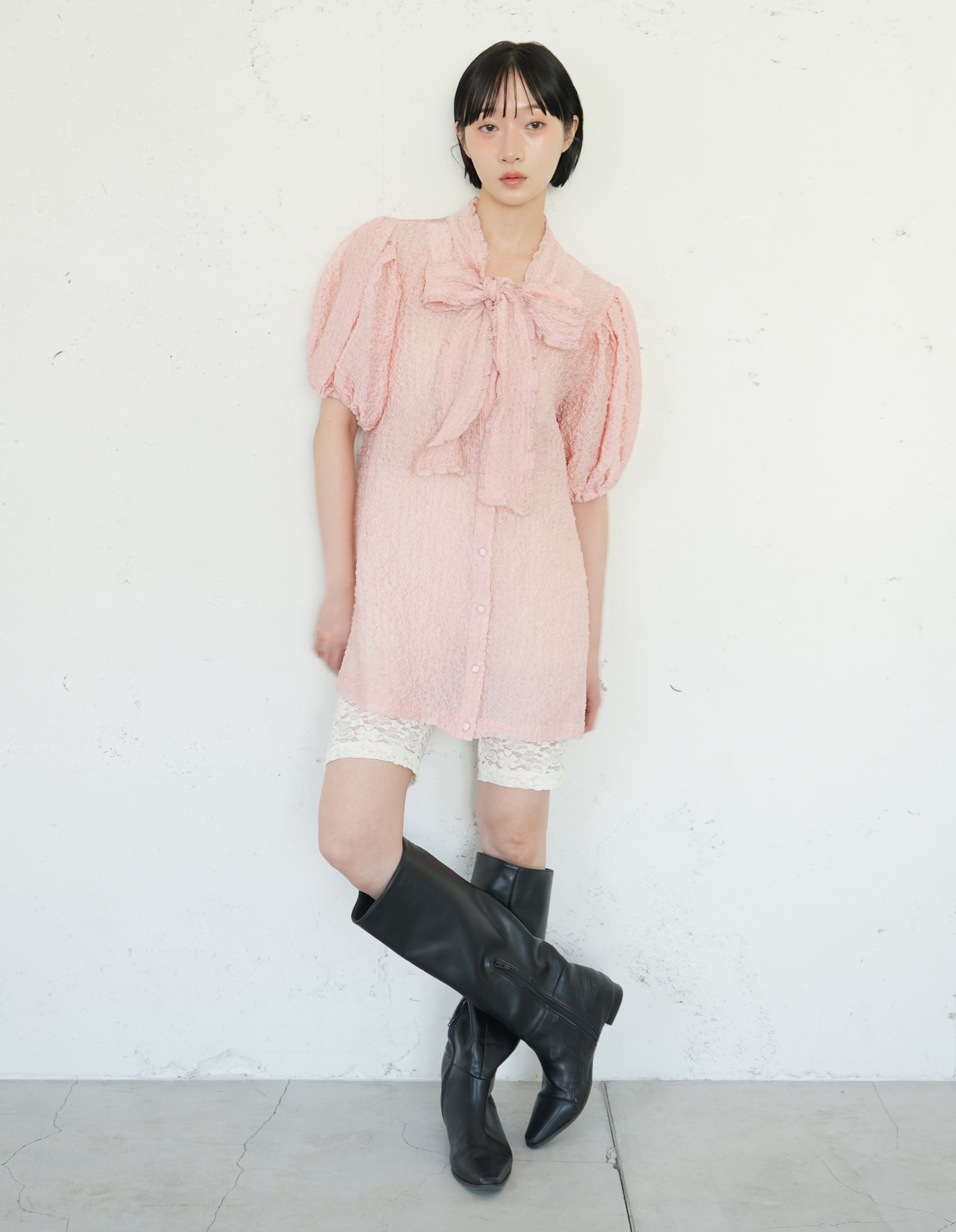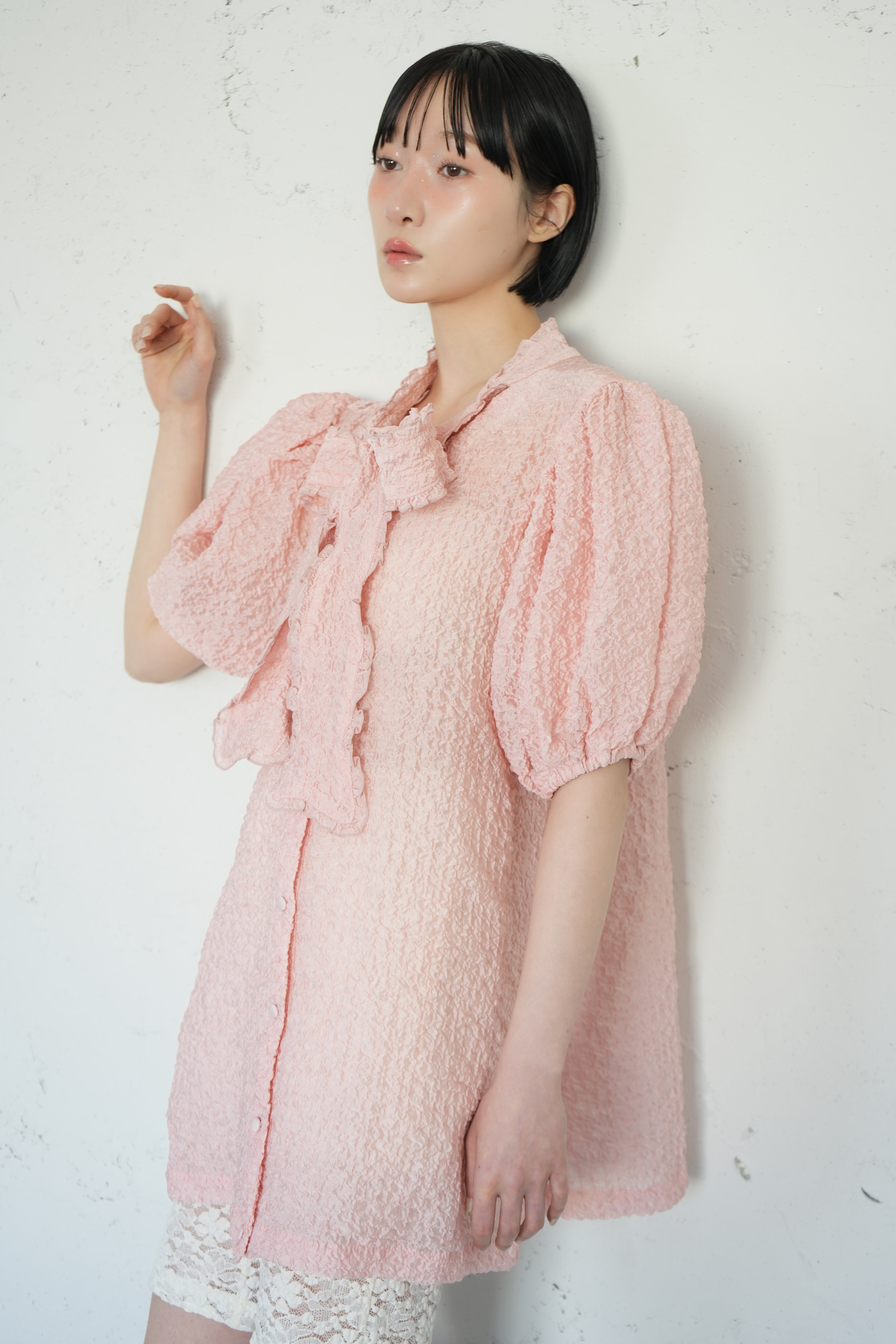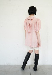 sismetryらしいボリュームのある袖に、フリル付きのボウタイでガーリー要素をプラス。 薄手で透けのある生地のため抜け感のあるコーディネートが叶います。