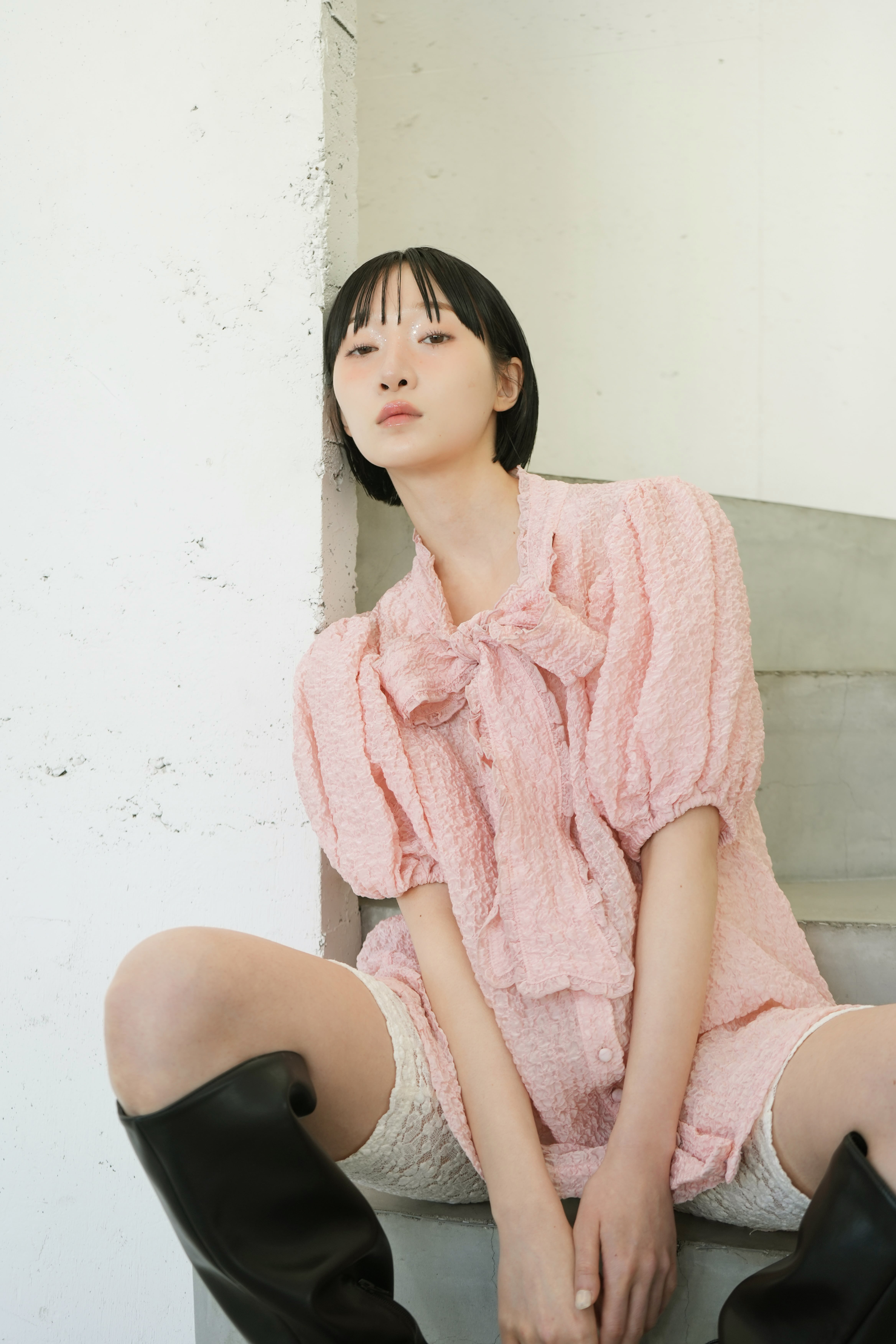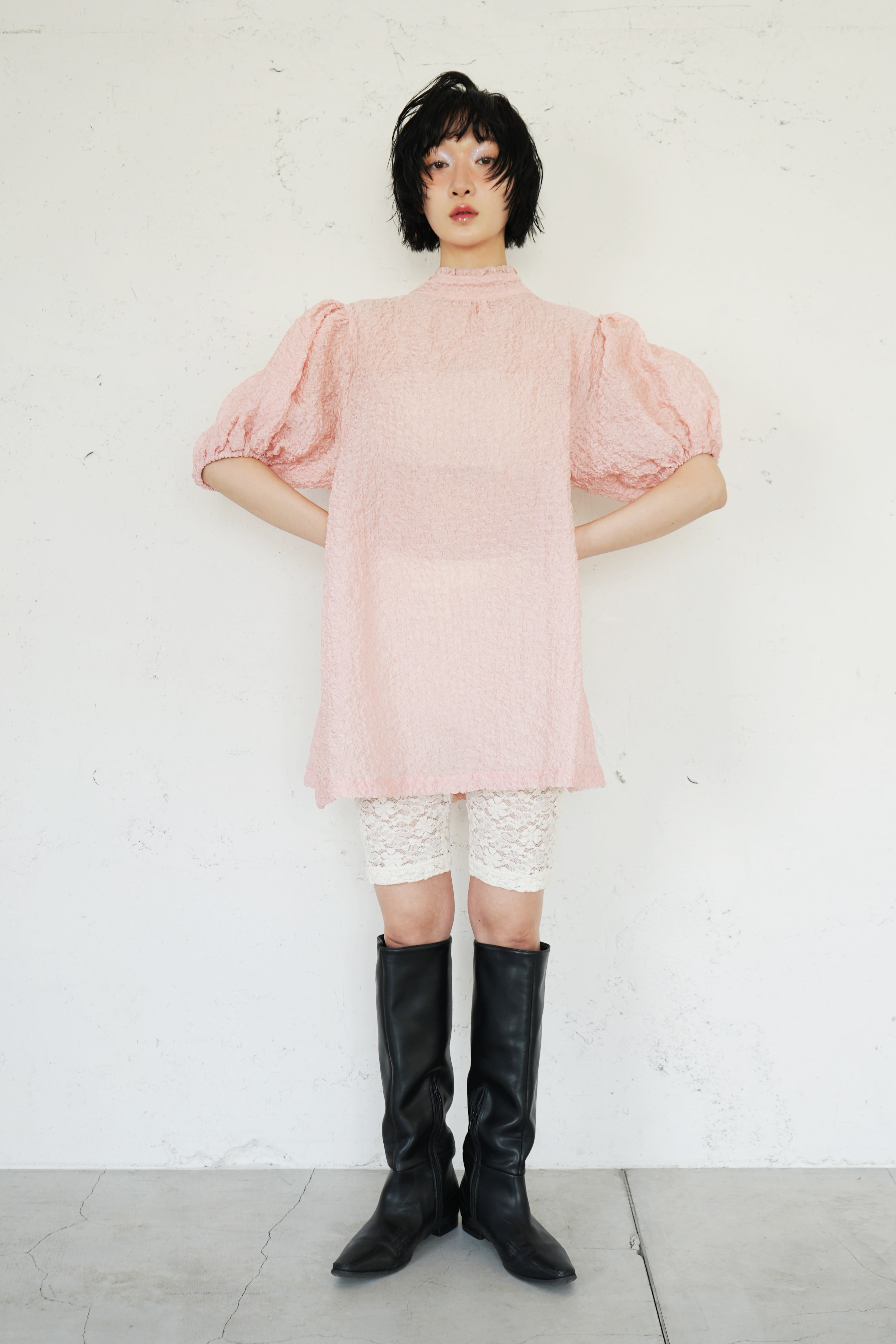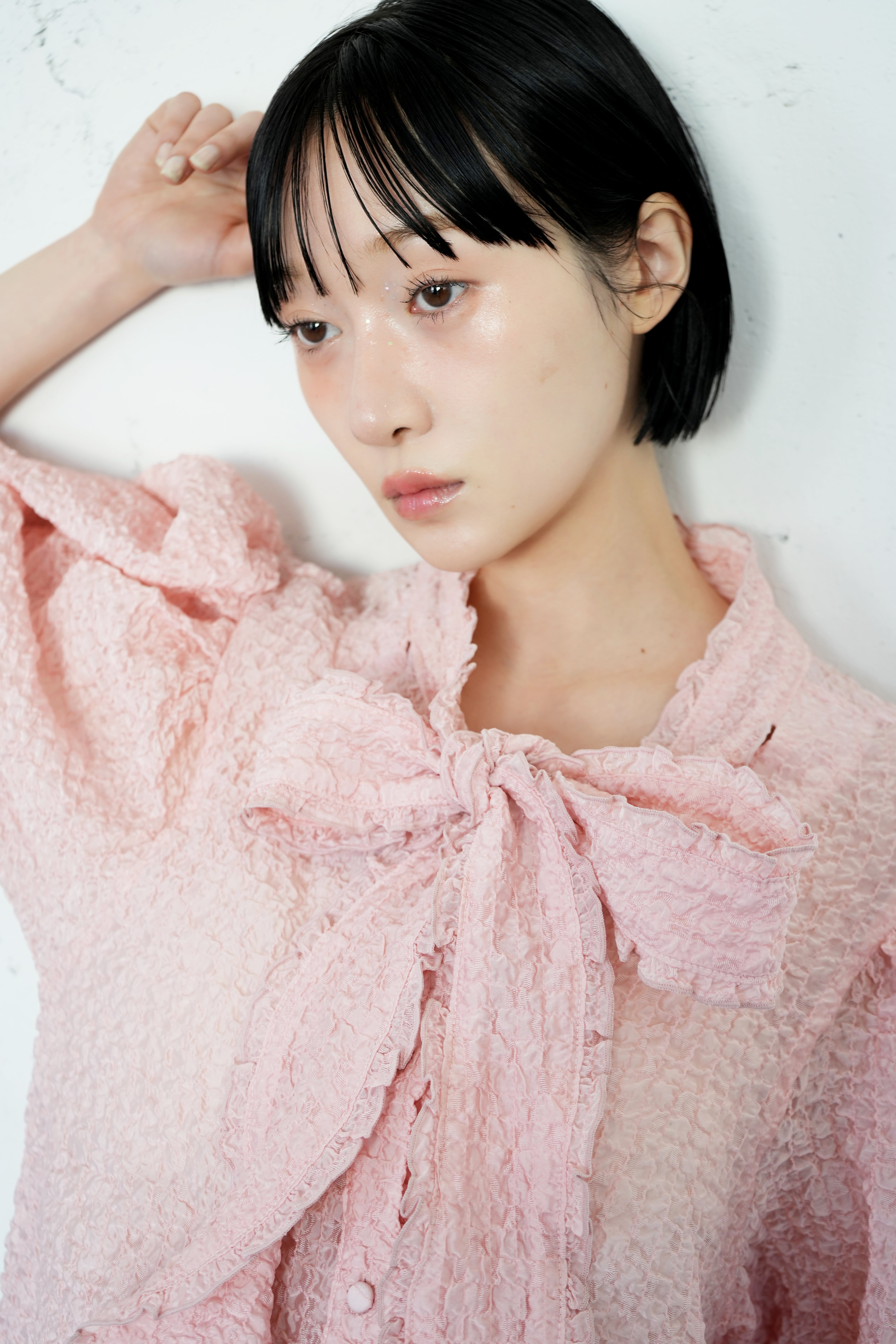 sismetryらしいボリュームのある袖に、フリル付きのボウタイでガーリー要素をプラス。 薄手で透けのある生地のため抜け感のあるコーディネートが叶います。