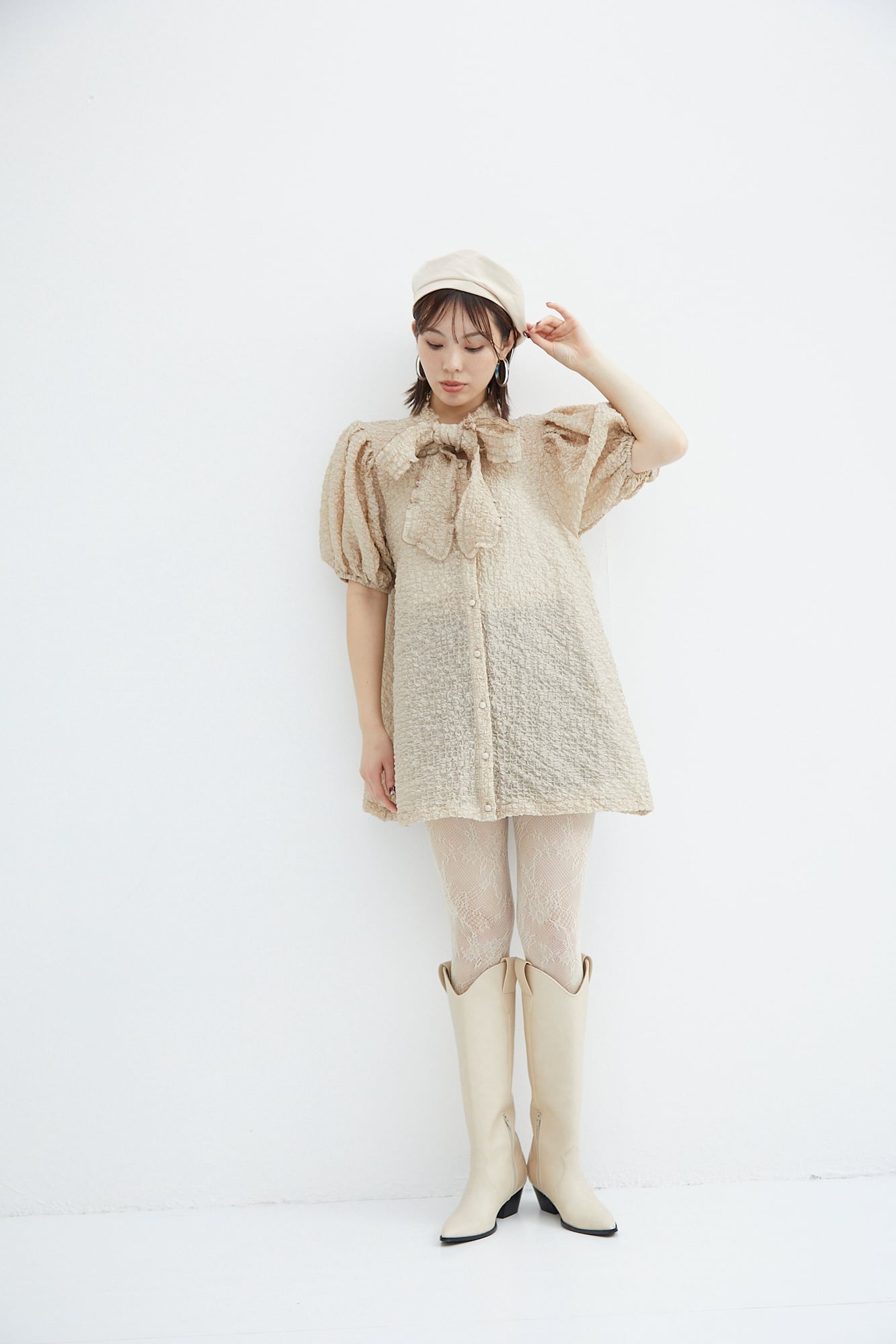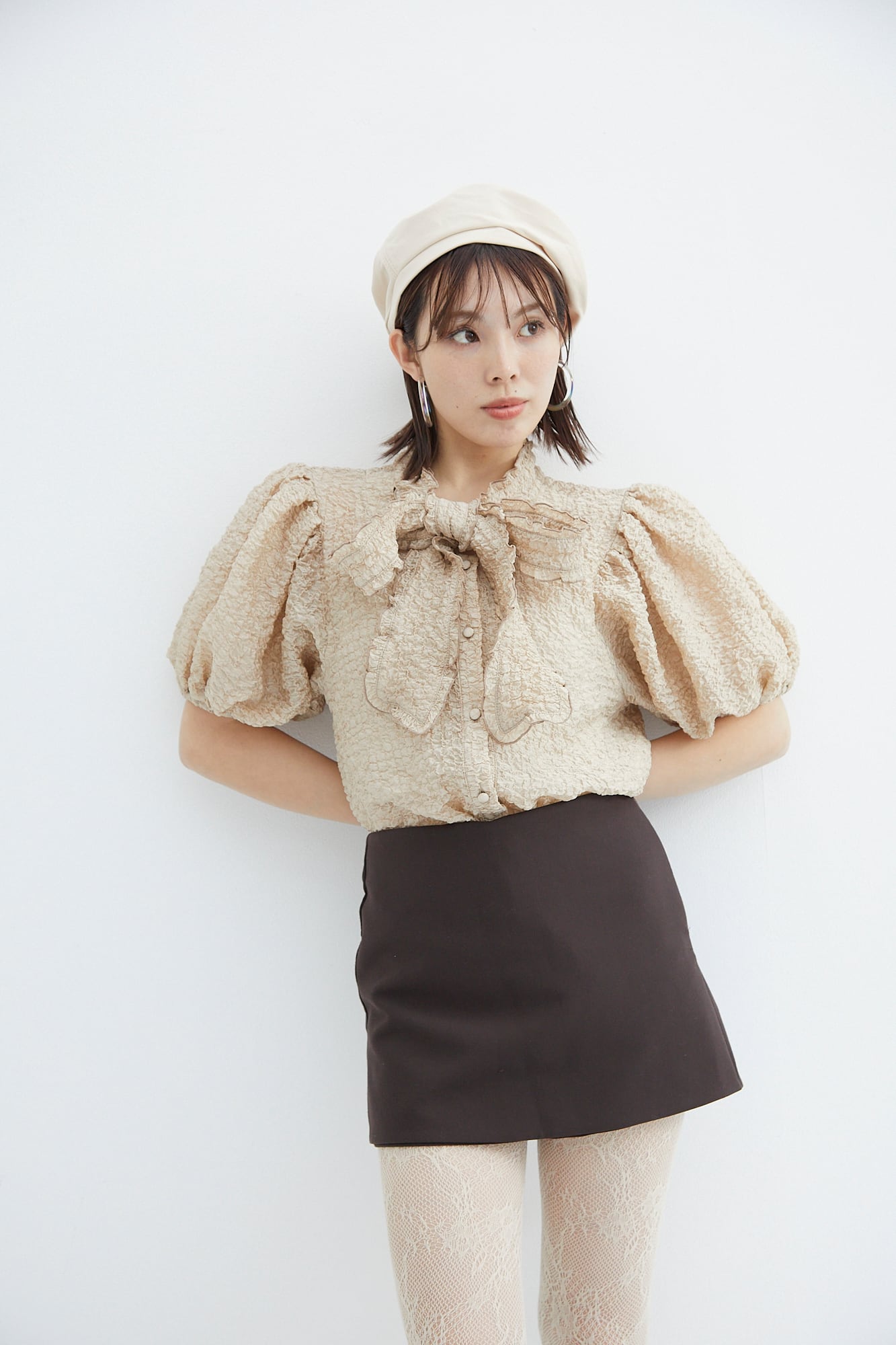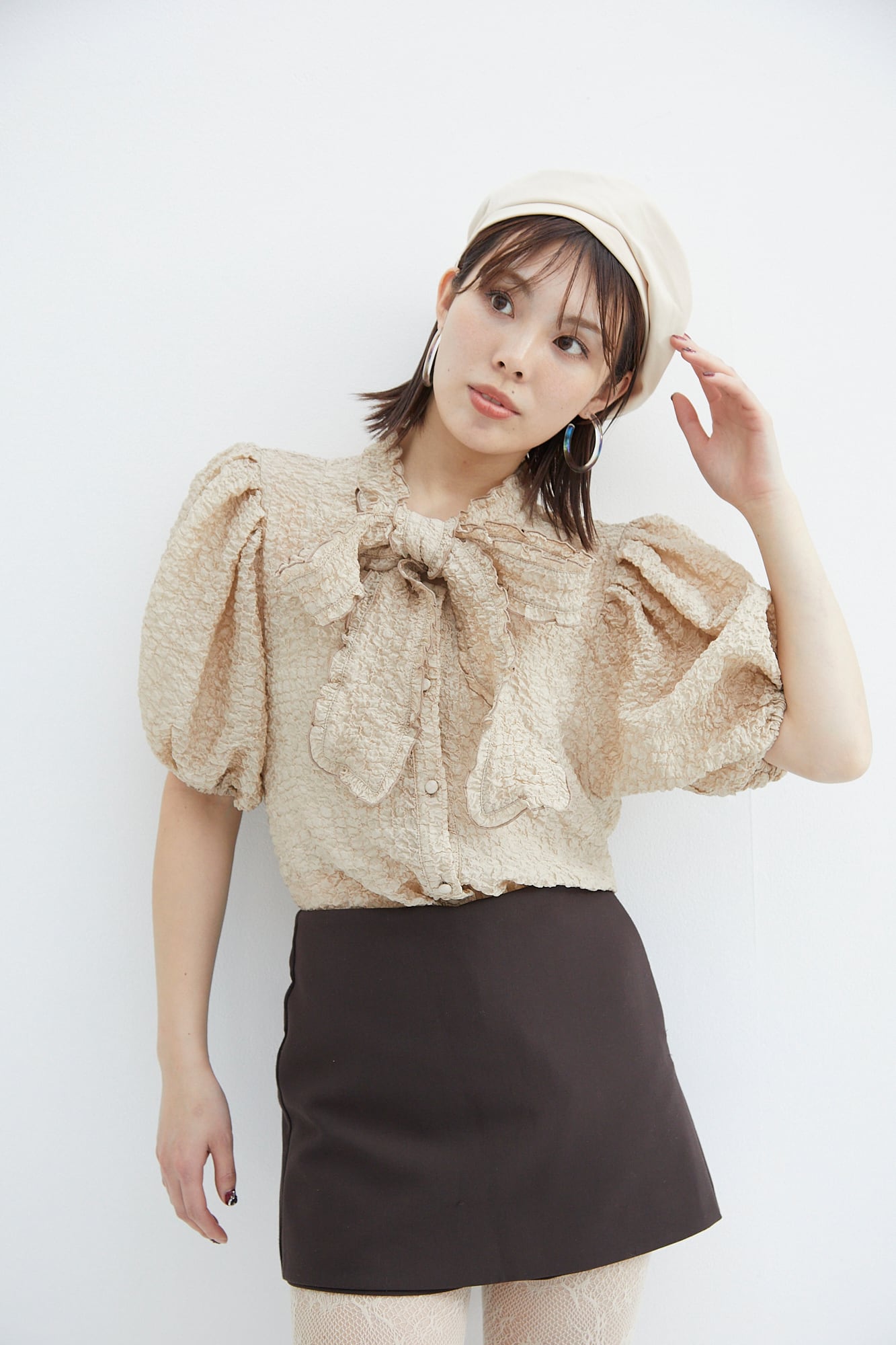 sismetryらしいボリュームのある袖に、フリル付きのボウタイでガーリー要素をプラス。薄手で透けのある生地のため抜け感のあるコーディネートが叶います。