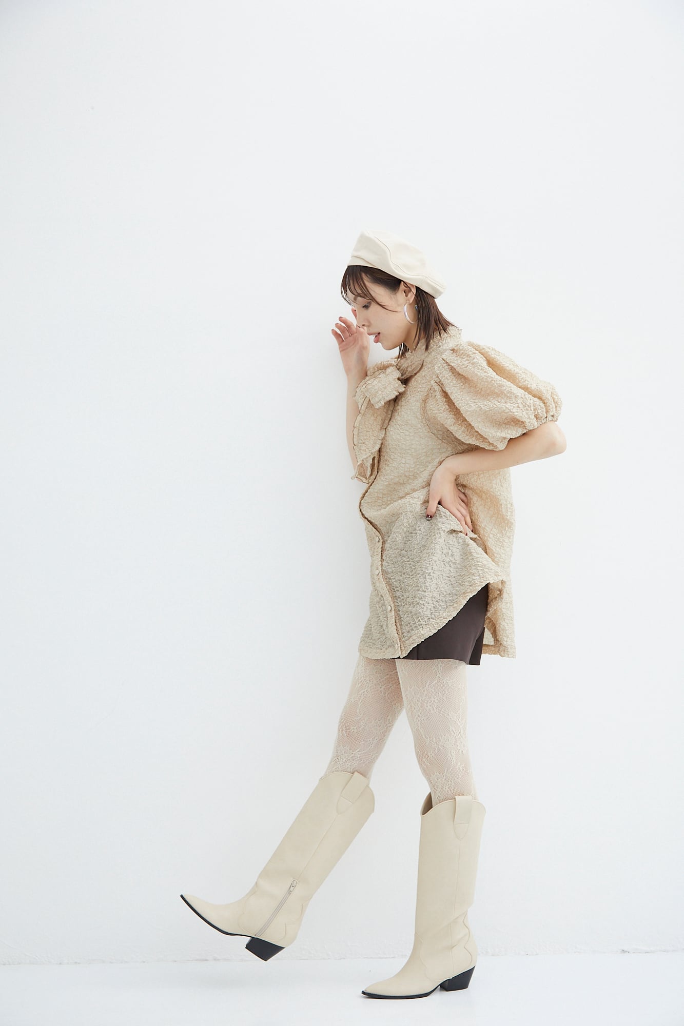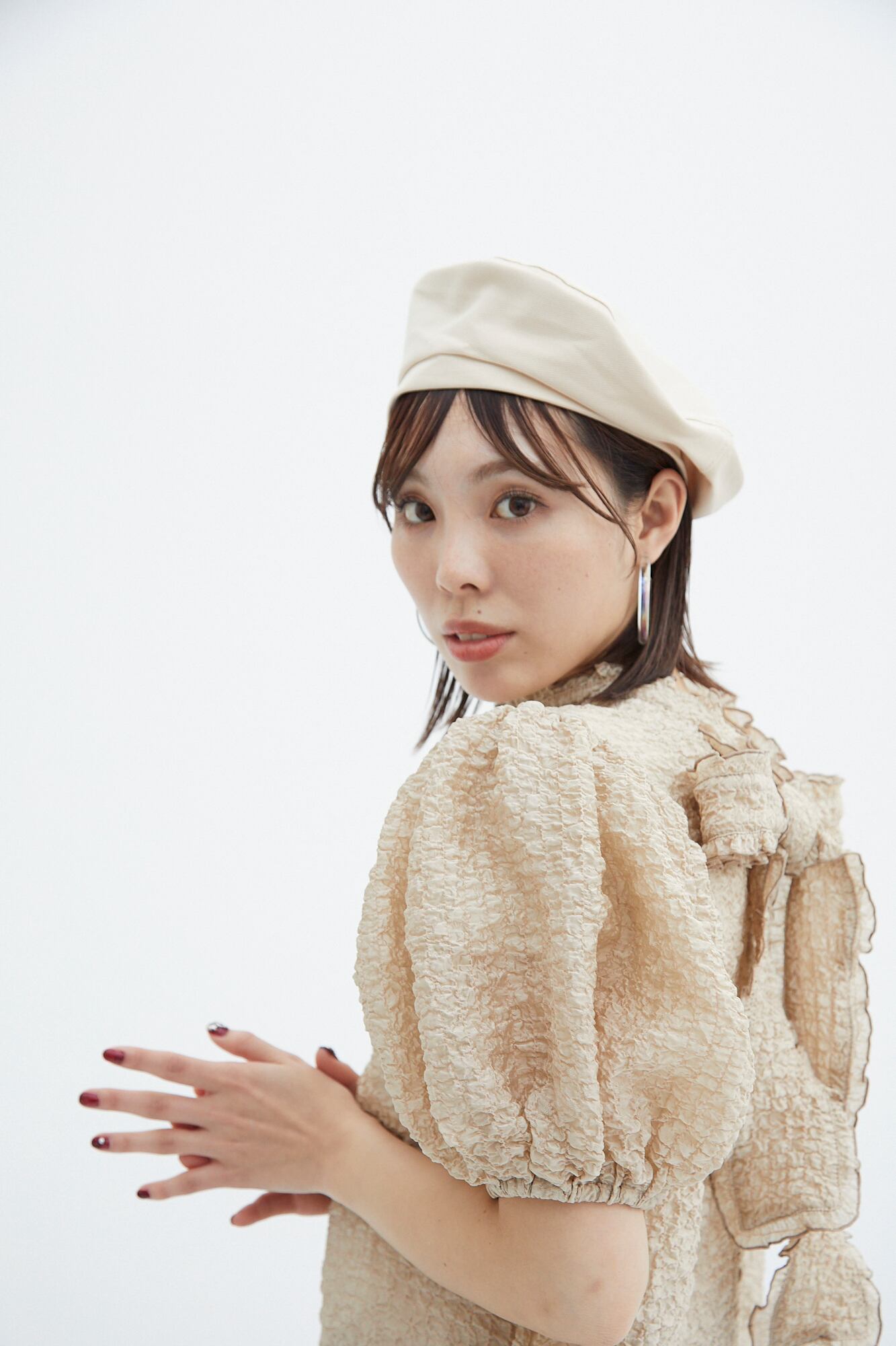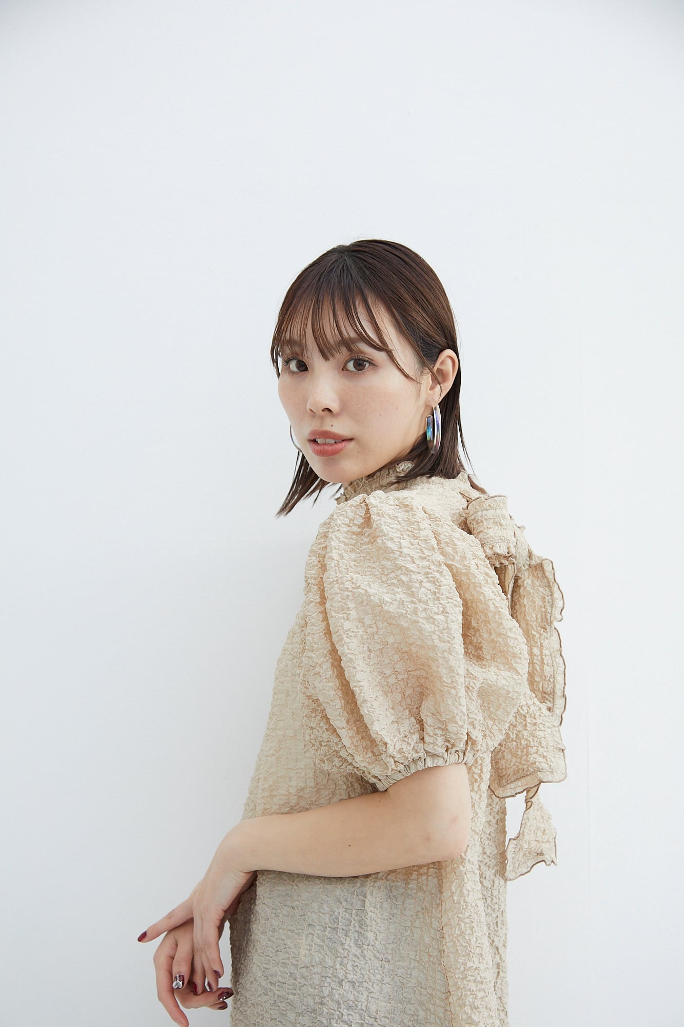 sismetryらしいボリュームのある袖に、フリル付きのボウタイでガーリー要素をプラス。薄手で透けのある生地のため抜け感のあるコーディネートが叶います。