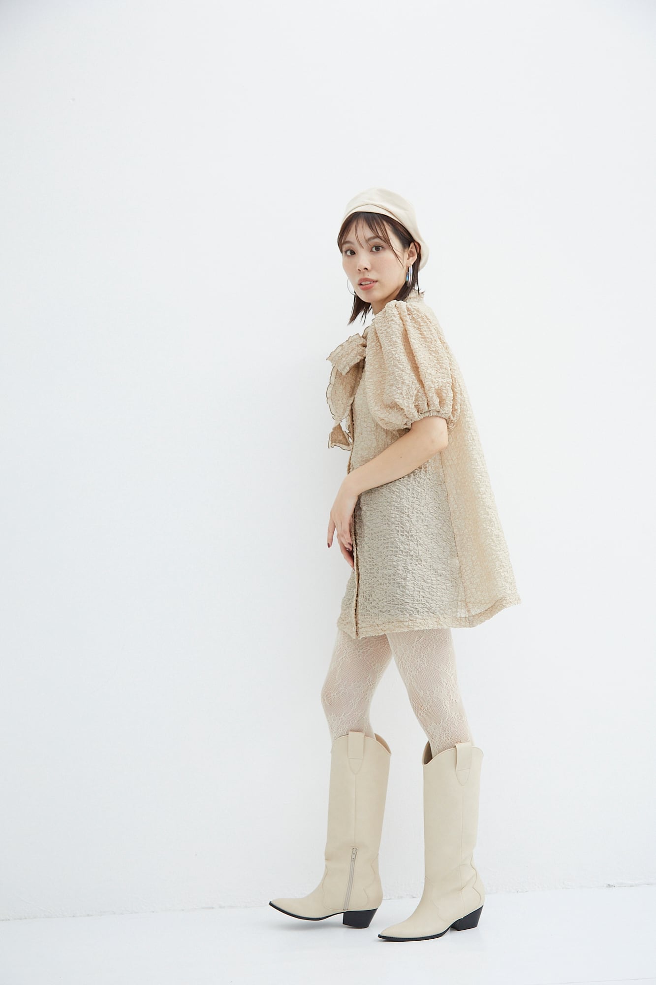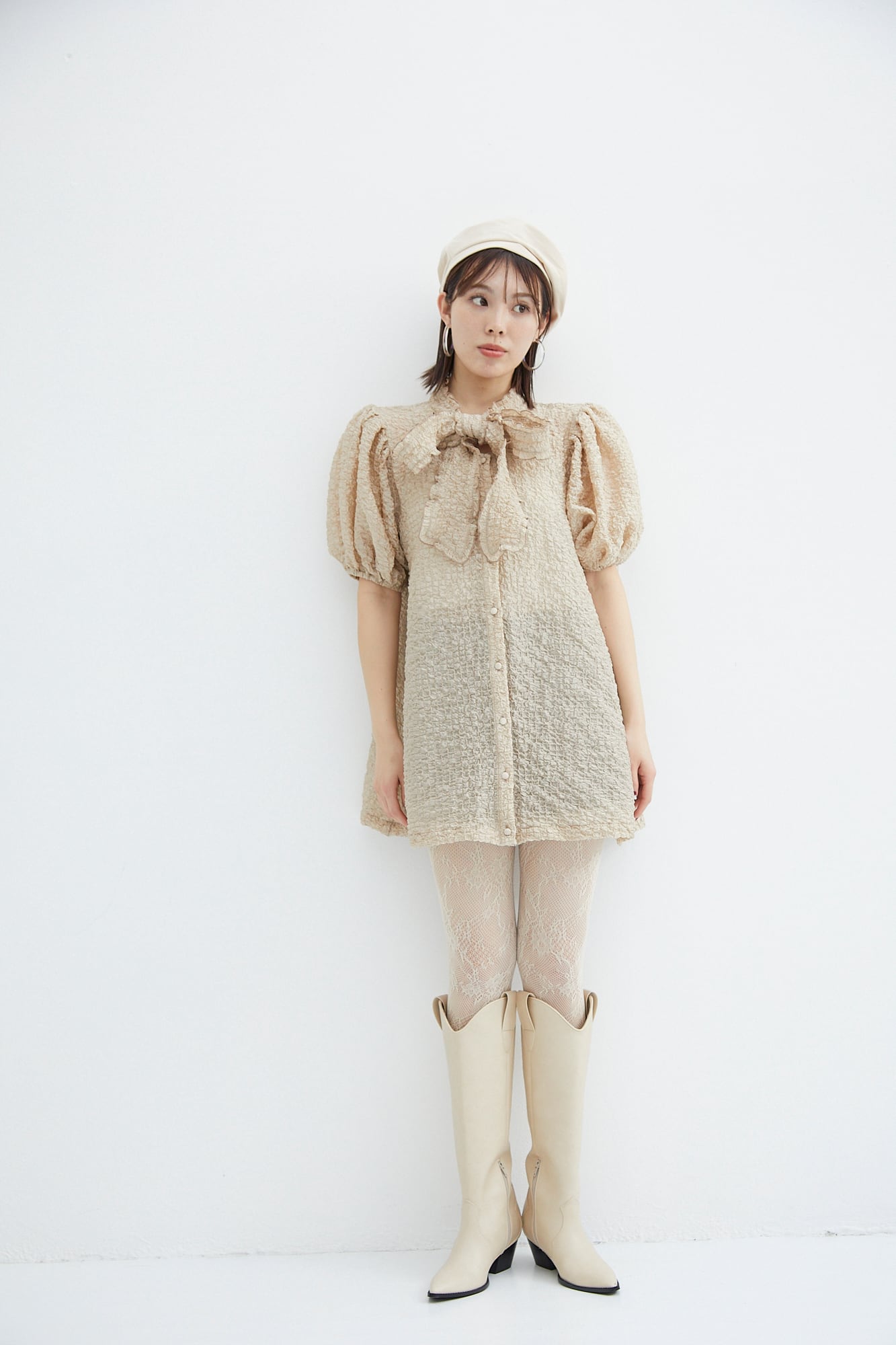 凹凸のあるポップコーンのようなシフォン生地を使ったボウタイミニドレス。